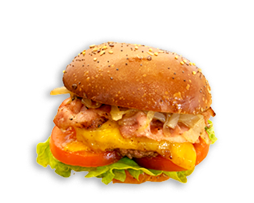 Pain Brioché, Sauce au 3 Poivres, Salade, Tomate, Oignons cuits, Steack haché Charal Grand Cru 120 Gr, Poitrine fumé, Fromage à raclette