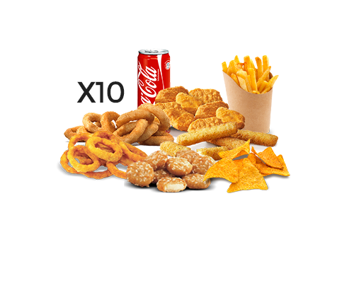 Oignons rings, Mozza Stick, Nuggets Crispy, Calamar Ring, Bouché Camembert, Nachos cheeseau choix + frites + Sauces
